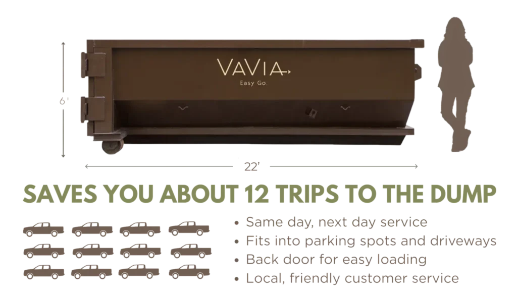 Renting a dumpster can actually save you money if you're dealing with a lot of waste. You might end up paying more for gas and fees and the time at the dump if you try to haul it all yourself. The great thing about the VaVia dumpster rental price is that your invoice will cover everything—drop-off, pick-up, and getting rid of your items while eliminating the need for you to sort and haul waste to different disposal locations. You can just focus on your project!.